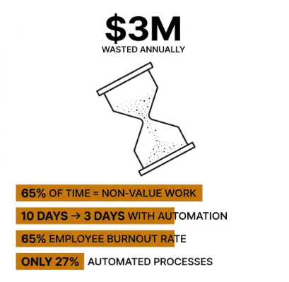 The average employee spends 60-65% of their week on work that doesn’t create new value. That’s nearly 3 out of every 5 days lost to inefficiency. More than half of employees spend at least two hours daily on repetitive tasks, while 60% of workforce time goes to “work about work” rather than skilled work.